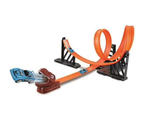 Ele percorre a pista, e com sua energia cinética consegue vencer os loops de 360.