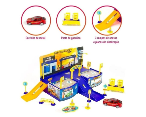 Informações do Produto: Um estacionamento muito legal e cheio de diversão. Nele a criança pode simular o concerto dos carrinhos na auto mecânica, estacionar e abastecer no posto de gasolina. Tem diversos itens de sinalização de trânsito para estimular a organização e aprendizado.