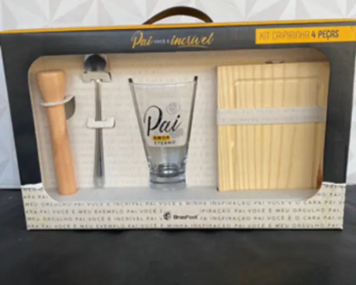 Agora seu pai pode aproveitar uma super caipirinha com muito estilo e irreverência. Uma caipirinha que se preze precisa de ingredientes de boa qualidade e um kit de respeito. O Kit Caipinha é composto por um copo, socador, colher e uma tábua e vai te auxiliar no preparo de uma das bebidas mais famosas do país. Só vai ficar faltando o limão, a cachaça, o açúcar e o gelo pra ficar no ponto e você aproveitar. Características: Altura: 23,5 cm Largura: 10,5 cm Comprimento: 38 cm Capacidade: 400 ml Contém: 1 copo, 1 socador, 1 colher e 1 tábua Cuidados: Lavar com água e sabão neutro Não utilizar produtos químicos e abrasivos Choques e quedas podem danificar o produto