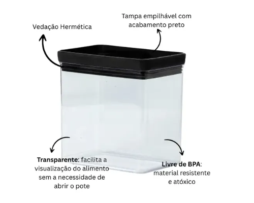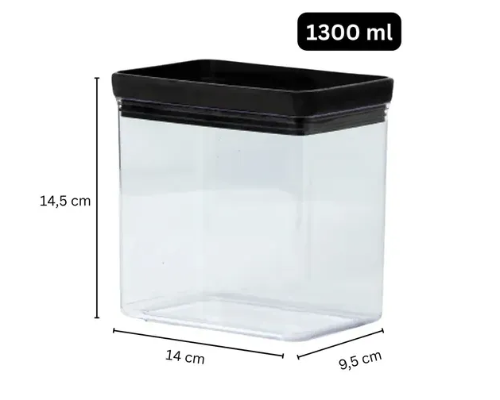 Pote Hermético Lumini Black Retangular 1.300 ml - ParamountO Pote Hermético Lumini Black Retangular 1.300 ml é a escolha ideal para quem busca praticidade, organização e conservação de alimentos no dia a dia. Com design moderno e funcional, ele oferece vedação segura que ajuda a manter o sabor e a textura dos alimentos por mais tempo.Seu formato retangular facilita o empilhamento, otimizando o espaço na geladeira, armário ou despensa. A transparência do pote permite visualizar facilmente o conteúdo, e o fechamento hermético evita vazamentos, odores e umidade.Características:Capacidade: 1.300 mlAltura: 14,5 cmComprimento: 14,0 cmLargura: 9,5 cmPeso: 0,200 kgCor: Transparente com detalhes em preto (linha Black)Material: Plástico resistente, com vedação em anel de siliconeLivre de BPA Indicado para: armazenar grãos, cereais, farinhas, biscoitos, snacks, temperos, legumes e sobras de alimentos.Ideal para manter sua cozinha mais organizada, prática e segura no armazenamento de alimentos.