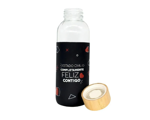 contém: 01 (uma) garrafa de vidro com tampa de plástico, madeira e silicone;