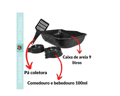 Prático e com cores vibrantes, ele possui bandeja e pá ideais para manter a higiene do seu gatinho e ainda acompanha comedouro e bebedouro.