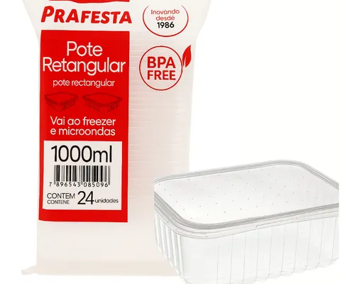 POTE PRAFESTA 1000ML RETANGULAR – Kit com 24 UnidadesAlta qualidade, vedação segura e reutilizável!Ideal para quem busca praticidade no dia a dia ou trabalha com delivery!Por que escolher nossos potes?Práticos e versáteis – Perfeitos para marmitas fitness, porções, refeições e armazenamento.Vão ao micro-ondas e freezer – Resistentes a altas e baixas temperaturas.Vedação eficiente – Tampa com encaixe firme que evita vazamentos.Reutilizável – Feitos em Polipropileno (PP), muito resistentes mesmo após várias lavagens.Empilhável – Economize espaço na geladeira, no freezer ou no delivery.Excelente custo-benefício – Ideal para uso doméstico, profissional ou revenda!